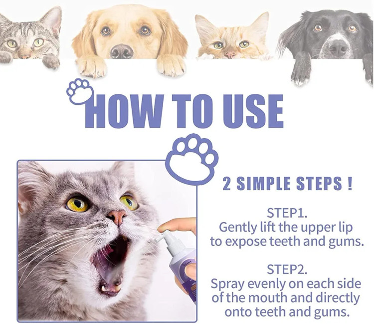 🔹 استفاده آسان: بدون نیاز به مسواک یا خمیر دندان! فقط اسپری را به طور مستقیم در دهان حیوان بپاشید و از نتیجه شگفتانگیز آن لذت ببرید.
