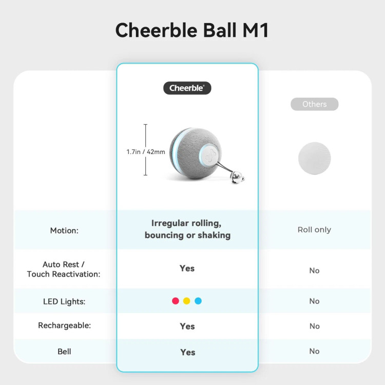 توپ هوشمند Cheerble M1 بدون نیاز به کنترل، با فشردن یک دکمه فعال میشود و با حرکات نامنظم، چرخش و پرشهای ناگهانی، حس شکار را در گربهها بیدار میکند و آنها را به تحرک و بازی تشویق میکند.
