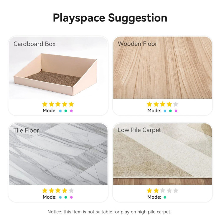 با برخورد به دیوار یا مانع، مسیر حرکت خود را عوض میکند و در گوشهها گیر نمیافتد. همچنین پس از 10 دقیقه بازی، 30 دقیقه استراحت میکند تا گربهتان بیش از حد خسته نشود.