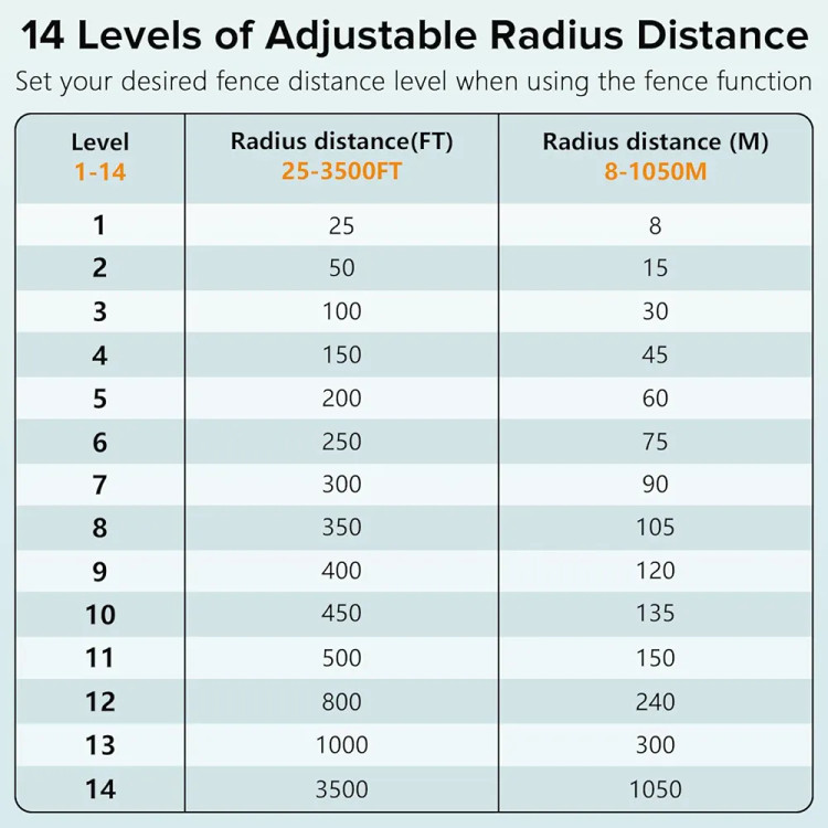 شما میتوانید شعاع محدودهی امن را در ۱۴ سطح مختلف (از ۸ تا ۱۰۰۰ متر) تنظیم کنید. به محض اینکه سگ از مرز تعیینشده خارج شود، قلاده ابتدا ۳ بار بوق هشدار و سپس بوق همراه با لرزش ارسال میکند.