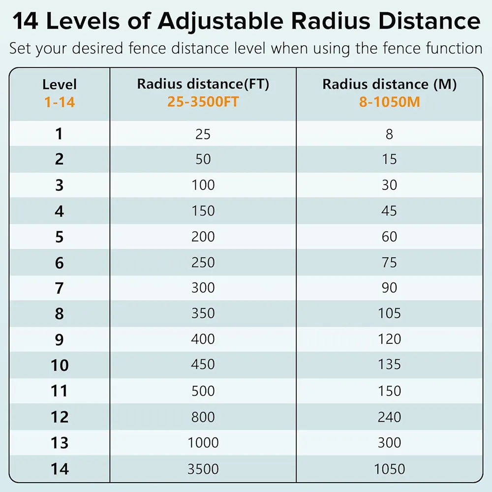شما میتوانید شعاع محدودهی امن را در ۱۴ سطح مختلف (از ۸ تا ۱۰۰۰ متر) تنظیم کنید. به محض اینکه سگ از مرز تعیینشده خارج شود، قلاده ابتدا ۳ بار بوق هشدار و سپس بوق همراه با لرزش ارسال میکند.