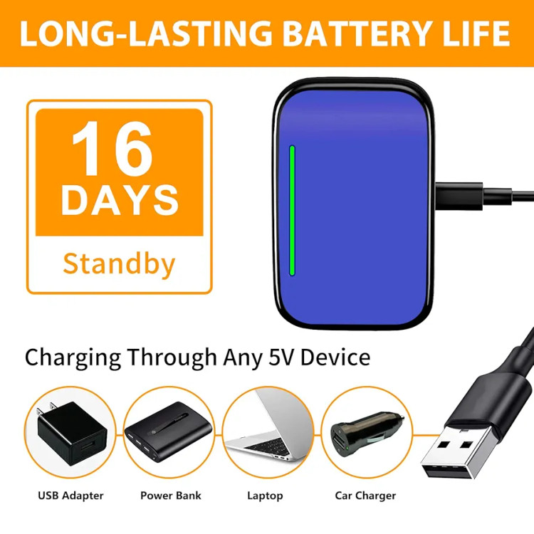 با استاندارد IP67 ضد آب، قلاده در برابر باران، برف و گل مقاوم است. با یک بار شارژ کامل از طریق کابل USB، تا 16 روز دوام میآورد و بهطور خودکار وارد حالت خواب میشود تا مصرف باتری بهینه شود.
