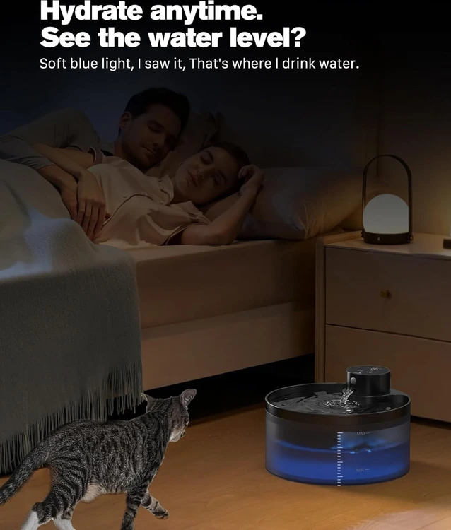 ظرفیت ۳.۲ لیتر و فوقالعاده بیصدا: فواره آبخوری گربه با در نظر گرفتن راحتی شما و حیوان خانگیتان توسعه یافته است و فواره آبخوری گربه به طور همزمان با آب پر میشود که میتواند ۷ تا ۱۰ روز برای حیوانات خانگی استفاده شود. پمپ با چراغهای LED، نور آبی ساطع میکند و با دسیبل < ۲۵ دسیبل کار میکند که نور را به شب میآورد و یک محیط آشامیدنی آرام برای گربهها فراهم میکند.