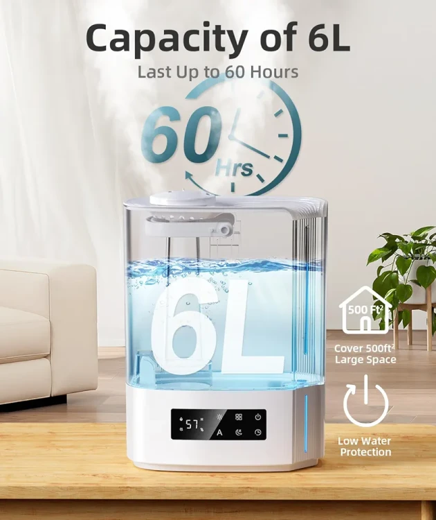 رطوبت ساز قوی، مناسب برای اتاق خواب و اتاق کودک: رطوبت ساز اولتراسونیک ما دارای یک مخزن بزرگ 6 لیتری (1.6 گالن) است که در اتاق های بزرگ تا 500 فوت مربع عالی عمل می کند. اجازه می دهد تا رطوبت طولانی مدت تا 60 ساعت.