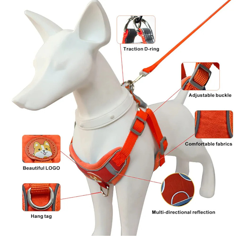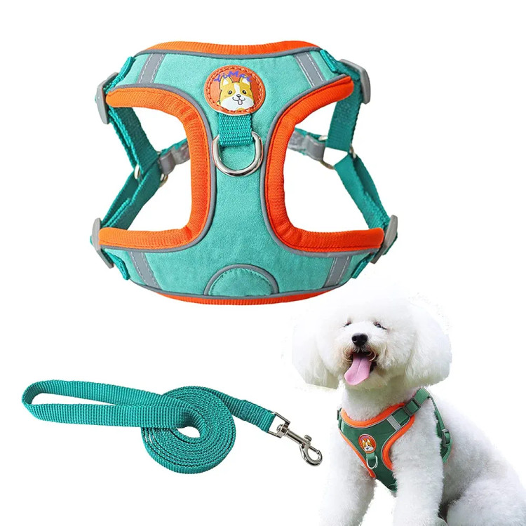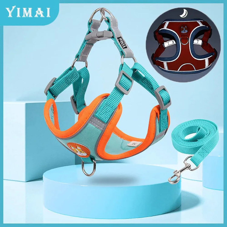 ست هارنس و قلاده سگ و گربه – ضد فرار، قابل تنظیم، تنفس‌پذیر، نرم و پددار با نوار شبرنگ – مناسب سگ‌ها و گربه‌های کوچک تا متوسط (سایز M، رنگ آبی)