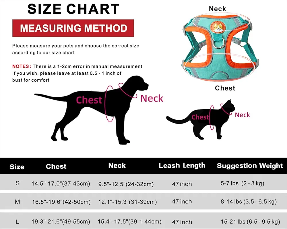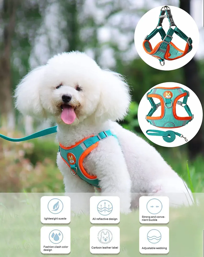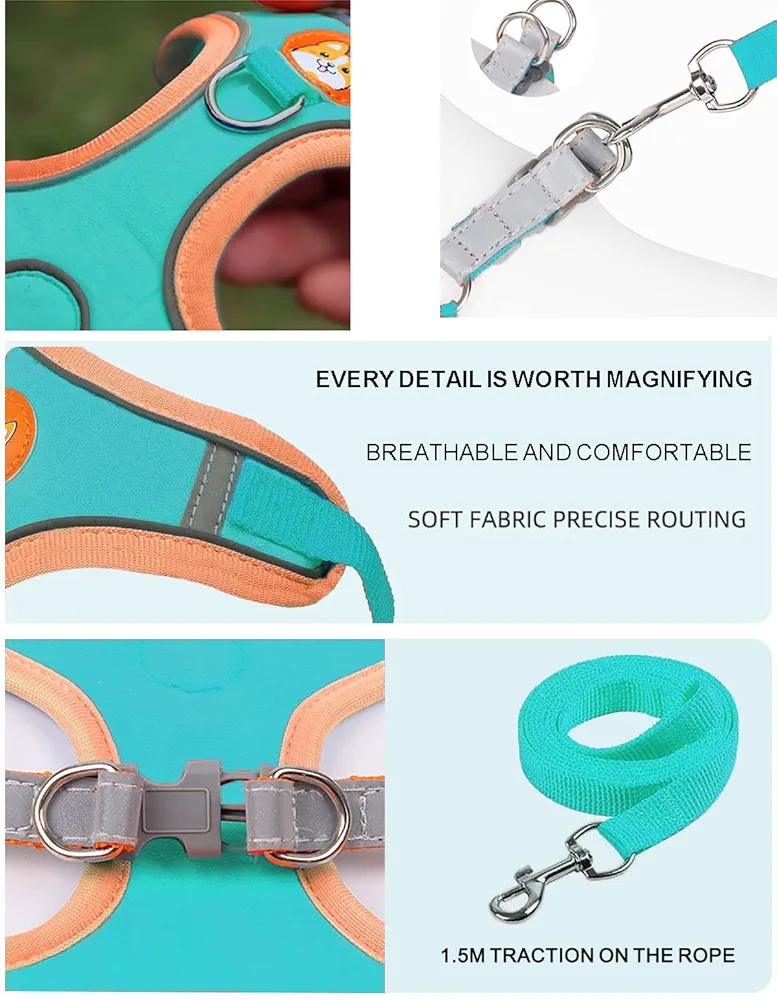 ست هارنس و قلاده سگ و گربه – ضد فرار، قابل تنظیم، تنفس‌پذیر، نرم و پددار با نوار شبرنگ – مناسب سگ‌ها و گربه‌های کوچک تا متوسط (سایز M، رنگ آبی)