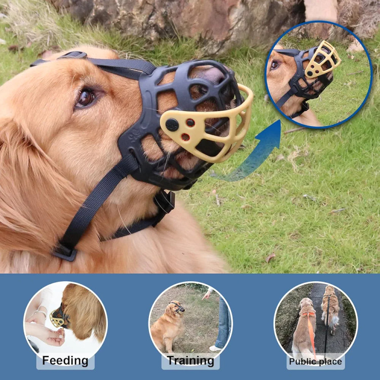 پوزهبند سبدی قابل تنظیم و نرم ساخته شده از جنس TPE ایمن (استفادهشده در قاشق کودک)، مناسب برای سگهای متوسط. طراحی ارگونومیک برای تنفس آسان، نوشیدن و خوردن راحت در عین حال جلوگیری از گاز گرفتن، جویدن، خوردن زباله و لیسیدن اشیاء. سبک، قابل شستشو و قابل حمل.